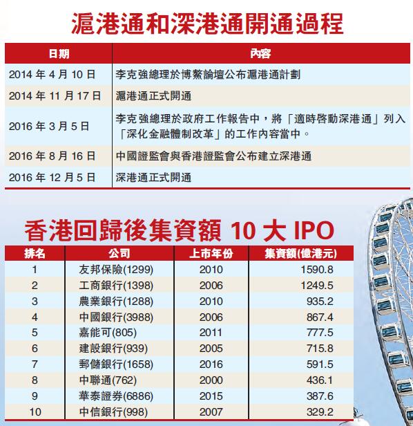 過去廿年,中國對香港的金融股市影響力與日俱增,而香港成為內地最大的境外融資平台,截止2016年,內地在港上市公司集資金額超過53431億元。回歸前,內地企業市值占港股總市值比重不足10%,現時內地企業已占港股比重60%以上。在2016年香港IPO上市的內地企業占比更達到90%左右,在IPO等投行業務市場占有率方面,中資投行市場亦已超過外資投行。1997年時香港新股上市保薦人清一色是外資及本地的投資銀行,如摩根史丹利、美林、巴克萊、瑞信等,2017年香港新股上市保薦人九成已是內地的投資銀行及券商,外商保薦人只剩美林美銀。雖然近年香港新股發行仍保持全球頭三位,但A股上市公司市值之總和已是港股的兩倍,成交金額也遠高於港股。