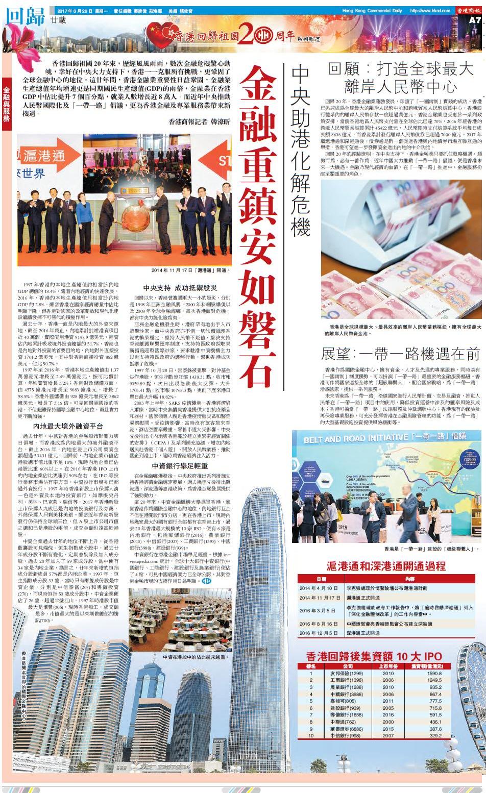 香港回歸祖國20年來,歷經風風雨雨,數次金融危機驚心動魄,幸好在中央大力支持下,香港一一克服所有挑戰,更鞏固了全球金融中心的地位。這廿年間,香港金融業重要性日益鞏固,金融業生產總值年均增速更是同期國民生產總值(GDP)的兩倍,金融業在香港GDP中占比提升7個百分點,就業人數增長近8萬人。而近年中央推動人民幣國際化及「一帶一路」倡議,更為香港金融及專業服務業帶來新機遇。香港商報記者韓濠昕
