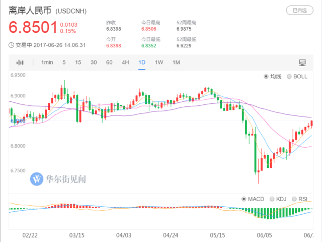 6月26日,離岸人民幣兌美元跌破6.85關口,刷新日低至6.8506,日內跌約140個點。人民幣離岸價創近一個月最弱。