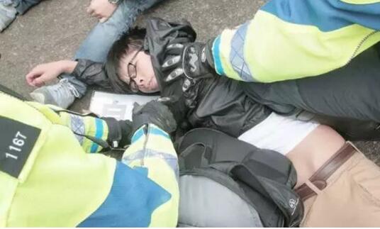 黃之鋒攔截張德江車隊時被警員制服按倒在地。