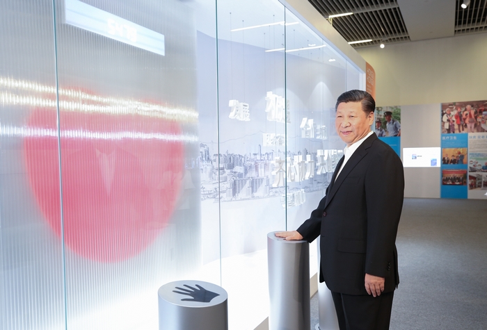 6月26日,中共中央总书记、国家主席、中央军委主席习近平在国家博物馆参观香港回归祖国20周年成就展。这是习近平按下“同心圆”互动装置的触摸板。这个“同心圆”互动装置代表着香港同胞和内地同胞齐心协力、携手合作,一起为国家发展贡献力量。