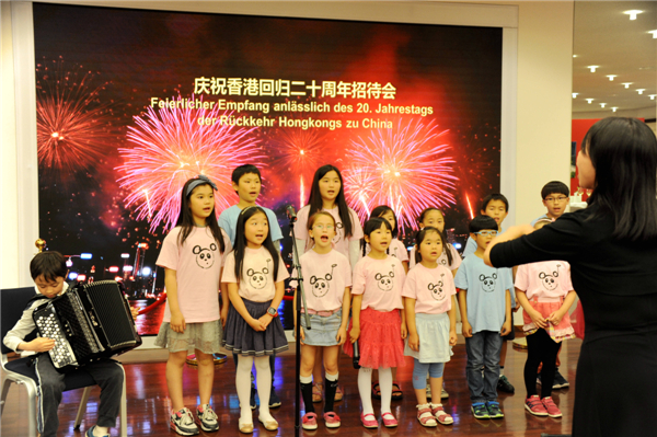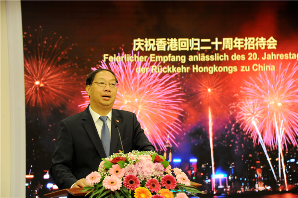 中新社柏林6月26日电 (记者 彭大伟)中国驻德国大使馆26日举行庆祝香港回归20周年招待会暨图片展。中国驻德国大使史明德、香港驻柏林经贸办主任何小萍出席招待会并致辞。