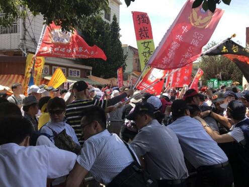 台灣地區領導人蔡英文原定26日下午2點到新竹縣湖口老街三元宮參加接匾活動。但不料其行程消息走漏,上百名反對台當局年金改革的退休公務人員到現場抗議,舉出“獨裁女妖”等標語,高喊“蔡英文下台”等口號,并同警方發生嚴重推擠沖突。因雙方僵持不下,蔡英文的相關行程已經取消。
