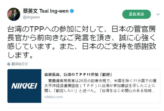蔡英文27日晚上8點左右用日語在推特上寫道:“台灣想要加入TPP(跨太平洋伙伴關系協議)一事,獲得日本官房長官菅義偉正面發言支持,讓台灣更加有信心。此外,對于日方的支持,再次表達感謝。”