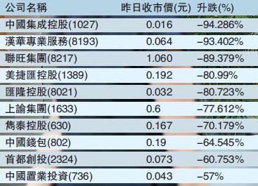 昨日的洗倉潮由漢華專業及美捷匯拉開序幕,其中,漢華專業於昨早公布去年業績,虧損擴大至1.24億元,股價洗倉式急跌,由「毫」股變「仙」股,開市已跌17%,其后跌幅擴大,最低曾見0.04元,創1年新低,收市報0.064元,跌93.4%。跌幅榜首位為中國集成,跌幅達94.3%。該股於2015年2月配股上市,曾經被證監會標示股權過度集中,市值曾於2015年9月炒高至477億元,經過昨日瘋狂斬倉后,市值只剩下12億元。