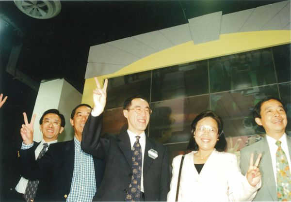 1995年唐英年獲入立法局,比出勝利手勢。資料圖片