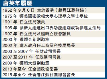 出身紡織世家的唐英年歷任多個公職,早在1991年就獲任立法局議員,開始涉足本港政壇;2002年更「棄商從官」,出任工商及科技局局長,翌年8月臨危受命任財政司司長;2007年6月又成為政務司司長。2009年,他獲大紫荊勛章。如今,經常笑容滿面、被市民親昵稱為「唐英年」的他依然活躍於政商界,為國家、香港、家鄉出謀獻策,貢獻有目共睹。
