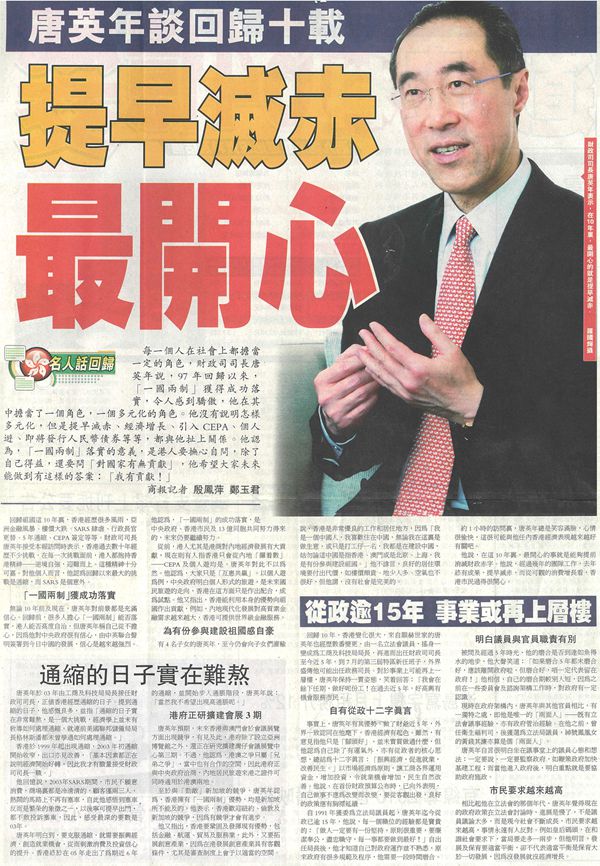 縱橫政商界數十年,唐英年總結過去20年經歷時形容,香港在實踐「一國兩制」、「高度自治」、港人治港過程中很成功。他說,特區政府對「一國兩制」、「港人治港」上「守得好緊」,中央政府亦充分尊重港人立場,一直不離不棄、不偏不倚地推行「一國兩制」,非常認真、嚴肅。於今,香港人已將「一國兩制」看成香港最重要的核心價值之一。