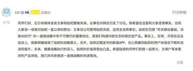 同學們好,近日有媒體發表文章稱貼吧要被關掉。此事在內網也引發了討論。我希望在這裏和大家澄清事實,也和大家談一談我對貼吧一直以來的想法:文章說公司要將貼吧關掉,這完全違背事實。貼吧在百度“夯實移動基礎,決勝AI時代”的一盤棋戰略中有不可替代的重要地位,是我們構建內容生態的鎖定型產品。