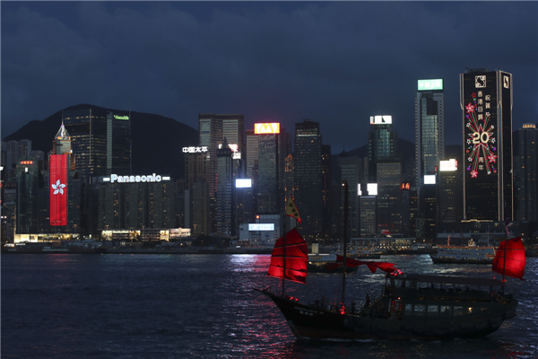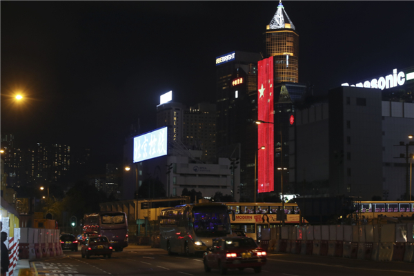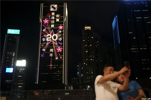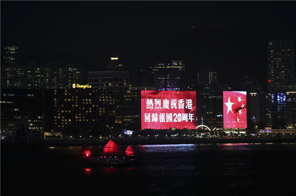 6月27日晚,在维多利亚港湾两侧霓虹闪烁,大厦上的电子屏“升起”巨幅五星红旗和紫荆花区旗,交替展现,并有“热烈庆祝香港回归祖国20周年”、“祝贺香港回归20周年”字样。中新社