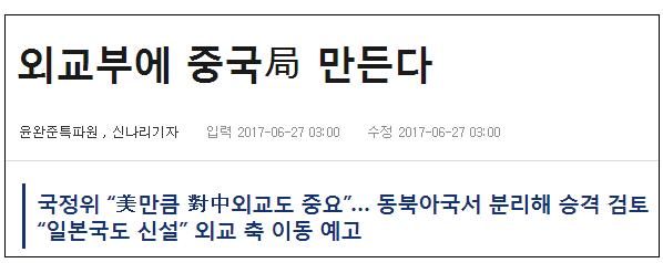 如此一來,韓外交部內負責對華和對日外交事務的部門將得到極大的擴充。韓國外交部現行的分工是,有兩個科負責中國事務、一個科負責日本事務,而美國則有三個科負責。