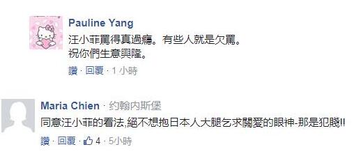 對此,台灣網友在“中時電子報”留言區表示,“汪小菲罵得真過癮。有些人就是欠罵。祝你們生意興隆”,“同意汪小菲的看法,絕不想抱日本人大腿乞求關愛的眼神-那是犯賤!”。還有網友表示,“哈哈漢奸請跪著,哇!看一群綠油油的人跪著,畫面挺好的”。