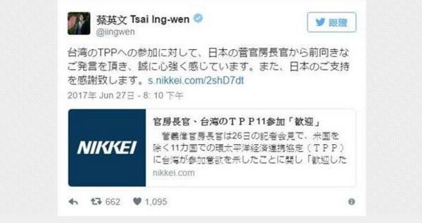 值得注意的是,台灣地區領導人蔡英文27日在推特以日文發文,對于台灣試圖加入TPP獲得日本官房長官菅義偉“正面發言支持”,她表示感到更有信心外,也感謝日方的“支持”。