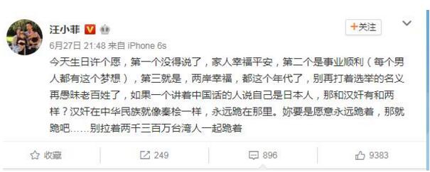 第三愿望他獻給了兩岸關系。他寫道,都這個年代了,別再打著選舉的名義再愚昧老百姓了,如果一個講著中國話的人說自己是日本人,那和漢奸有和兩樣?漢奸在中華民族就像秦檜一樣,永遠跪在那里。你要是愿意永遠跪著,那就跪吧……別拉著兩千三百萬台灣人一起跪著”