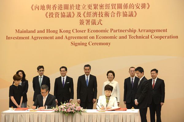 昨天,在行政長官梁振英及中聯辦副主任仇鴻等官員見證下,財政司司長陳茂波與高燕簽署協議。出席協議簽署儀式者,還包括商務及經濟發展局局長蘇錦梁。陳茂波在簽署儀式上表示,CEPA 推出以來產生的巨大經濟效益,說明香港成功落實「一國兩制」的偉大構想之餘,也充分體現內地與香港的優勢互補、互惠共贏;新簽署的協議將更符合兩地經貿發展需要,也符合國際貿易和投資新趨勢。