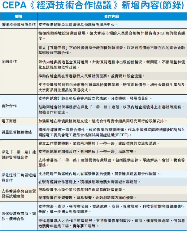 是次CEPA《經濟技術合作協議》在金融合作領域著墨甚多,除了推動實現H股全流通,還包括建立「互聯互通」下的投資者身份識別機制時間表,以及擴大香港市場的人民幣合格境外投資者(RQFII)的投資額度。