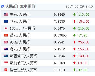6月29日,人民幣(6.7800, -0.0183, -0.27%)兌美元中間價報6.7940,較上日中間價升值113個基點。上日官方收盤報6.7992,夜盤收盤報6.7997。