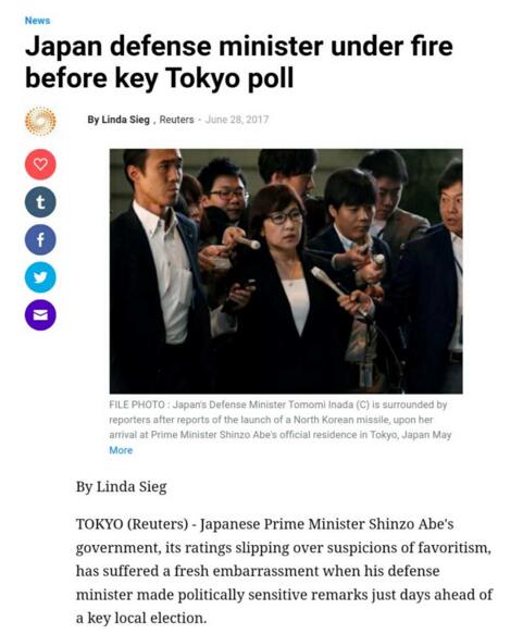 民進黨代表蓮舫批評稻田朋美將自衛隊當作“專聽令于自民黨的部隊”,并要求追究安倍的任命責任。