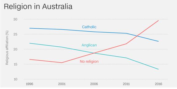 澳大利亞三大主要宗教信徒變化圖,紅色為無神論、藍色為天主教、淺藍為英國國教
