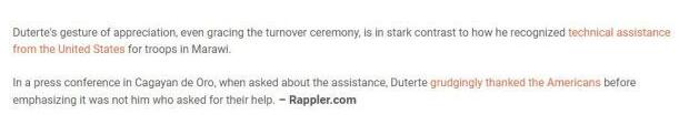 菲律賓媒體報道截圖:杜特爾特“很不情愿地”對美方表示感謝。