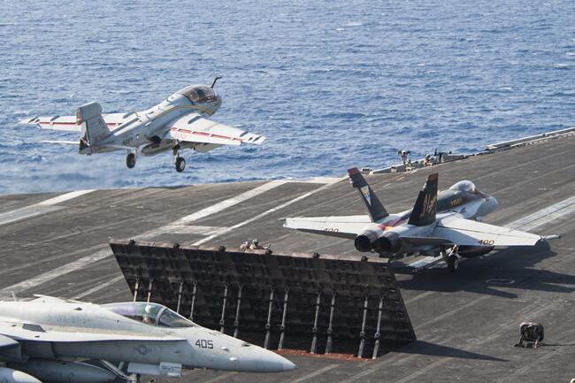 美軍喬治布殊號航母目前停泊在地中海東部,不時有戰機從甲板上起飛。網絡圖片