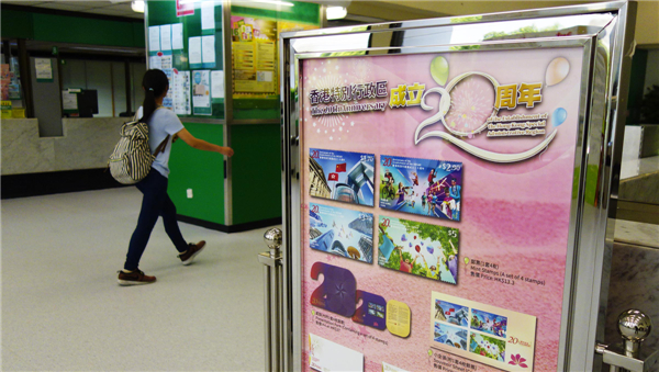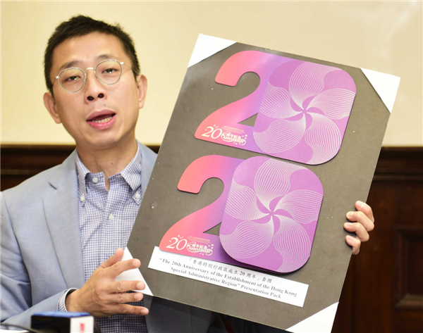 图为香港邮政高档经理(集邮推广)李振宇介绍以“香港特别行政区成立二十周年”为题的套折,内附一套4枚邮票,售价27港元。香港中通社