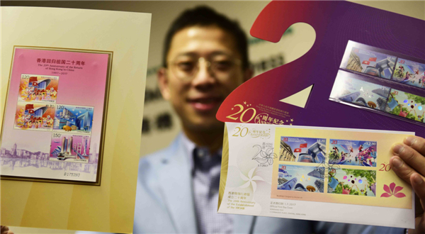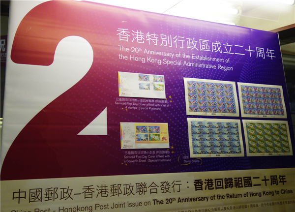 为庆祝香港回归祖国二十周年,根据国家邮政局审定的2017年纪特邮票发行计划,中国邮政7月1日发行《香港回归祖国二十周年》纪念邮票。该邮票一套3枚,表现内容分别为:龙腾香江、特区新颜、紫荆追梦。此外,同时发行的还有中国邮政与香港邮政共同印制的同题材邮票小全张1枚。