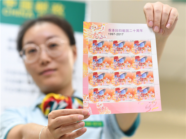 6月29日,北京的邮政工作人员在展示《香港回归祖国二十周年》纪念邮票小全张。