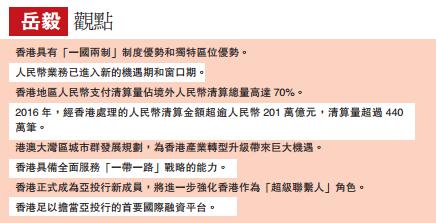 香港是亞太地區重要的國際金融中心、「21世紀海上絲綢之路」的重要節點,以及全球華人經濟網絡的中樞。隨著近期香港正式成為亞投行新成員,這三大優勢將會疊加起來,進一步強化香港作為「超級聯繫人」角色。岳毅認為,此次是亞投行首次接納非主權地區加入作為正式成員,充分體現了「一國兩制」優勢,也與香港特殊的金融地位密不可分。