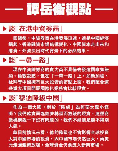 交銀國際首席執行官譚岳衡表示,在港中資券商的迅速發展,離不開中國經濟的長期增長,及國家鞏固香港作為金融中心的政策支持。
