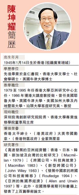 「大灣區其實是相輔相成的。香港和內地互相需要、資源和優勢互補,內地也可以從香港得益,包括香港的人才、香港的制度、香港營商的經驗,尤其是金融業務的經驗,以及整個現代服務業等對大灣區都有很多助益。」陳坤耀說,如今,中國最需要發展的就是現代服務業,從中央給予前海四個現代服務業的使命就可窺見一斑。因為中國第二波經濟發展需要結構轉變,即由成熟的制造業轉移到現代服務業,香港現代服務業幾十年的經驗,無疑會對大灣區的發展作出很多貢獻。