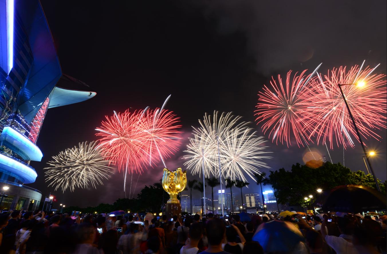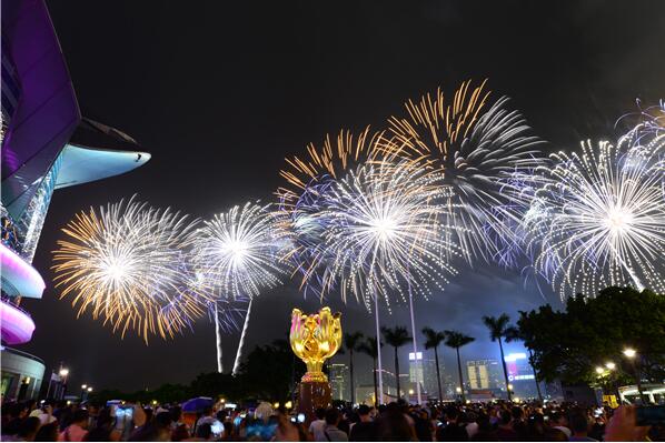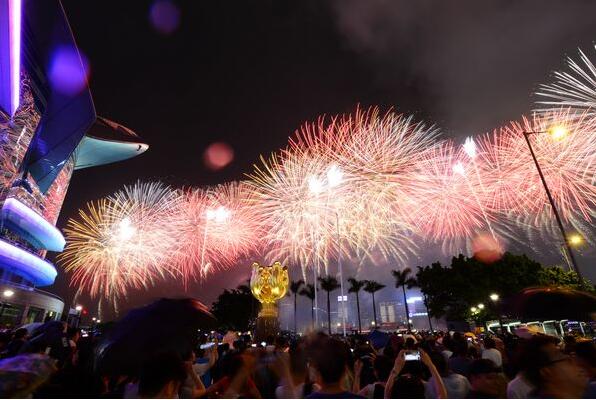 【香港商報网訊】記者萬家成報道:「慶祝香港特別行政區成立20周年烟花匯演」昨晚在維港上演,全長歷時23分鐘,匯演共分8幕,由5艘躉船發放39888枚烟花彈,今次烟花匯演更首次引入「時間延遲」烟花技術,每個圖案在半空維持4至5秒,令人耳目一新。維港兩岸估計有逾30萬市民及游客冒小雨觀賞烟花;包括有內地人一家大小由深圳來港觀賞,希望感受回歸20周年的氣氛。