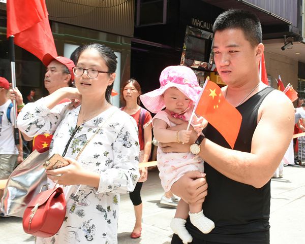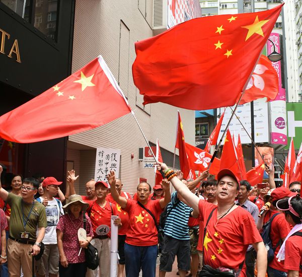 「同心護港」及「珍惜群組」等成員聚集超過50人,昨由銅鑼灣東角道游行至柯布連道,慶祝習近平蒞港、兩屆政府成功交接及香港回歸20周年等,期間成員高舉國旗及揮動小國旗,大叫「23條立法、港獨必要殺」、「港獨亂港數十載、反華亂港心不改」、「假民主、害香港」等口號,之后高唱愛國歌曲,并向途人派發小國旗。