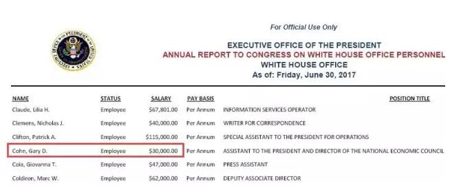 我們都知道,在特朗普政府當中任職的不乏一些企業高管,但是有些高管在白宮的薪酬顯然不及在企業中的水平。比如任總統助理和國家經濟委員會主任的Gary Cohn,他是備受特朗普信賴的經濟顧問,但年薪只有3萬美元。作為高盛前首席執行官,這一薪酬水平遠不及他在企業時的收入。