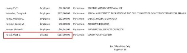 在這份長達16頁的文件中,詳細披露了白宮職員們的薪酬水平。其中,超過40%的白宮雇員年薪超過10萬美元,資深政策顧問Mark House的年薪最高,為18.71萬美元(約合人民幣127萬元),他也是僅有的薪酬超過18萬美元的白宮雇員。不過令人驚訝的是,還有3個人的薪酬竟全部為零。