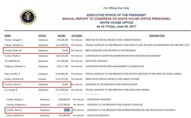 沒錯,這3名工資為零的雇員當中,有兩人分別是特朗普的女兒伊萬卡和女婿庫什納。