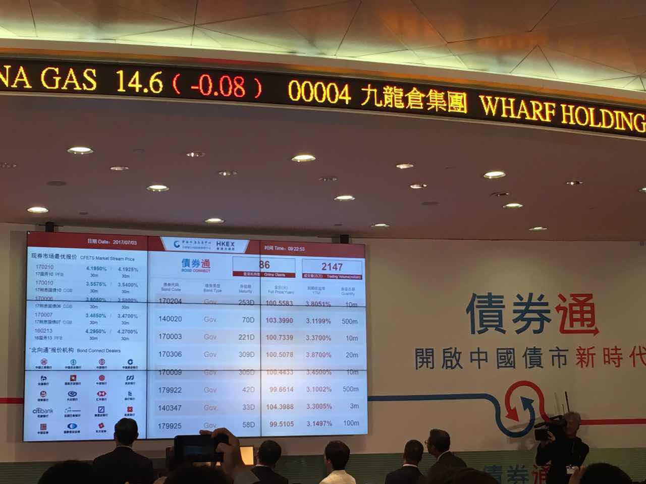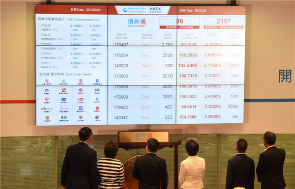 【香港商报网讯】记者木子、邝伟轩、实习记者李卓成报道:今日(7月3日)上午9时22分,債券通啟動儀式”在香港舉行,“債券通”正式通車,“儀式由港交所總裁李小加、中國外匯交易中心副總裁張漪共同主持,出席債券通啟動儀式的嘉賓有香港行政長官林鄭月娥、國務院港澳事務辦公室副主任黃柳權、中國人民銀行副行長潘功勝、香港金融管理局總裁陳德霖、香港交易所主席周松崗等。今日下午还將舉行債券通投資者論壇,潘功勝、李小加等將發表演講,詳述債券通的運作細節。据悉,交易系統顯示,債券通啟動瞬間,有86家交易商在線,成交額21.47億元。截至九點半,已有86家海外投資者在線,投資金額達21.57億元人民幣。