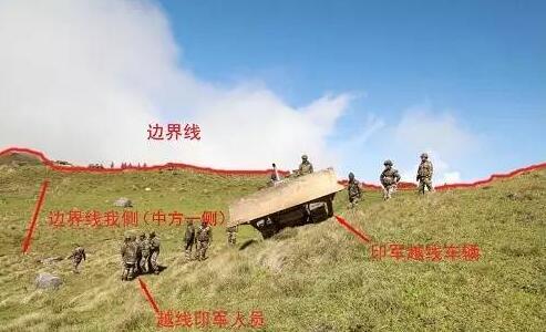 陸慷展示的照片可以清晰看到,印度士兵和車輛明顯越過了作為邊界線的分水嶺,進入到中國境內。這張照片拍攝于6月18日。