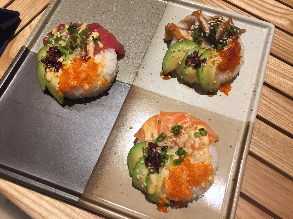 想嘗試新式的壽司料理可以到頤之味壽司吧,由入廚超過四十年的日籍主廚香月利久主理,賣點是魚鮮一個星期由日本來貨11次,特設冷凍房和魚房,每日即新鮮水產,確保刺身鮮美。筆者最愛招牌西村壽司,以九州免治拖羅蓉、三文魚籽、北海道甜蝦和馬糞「層層疊」而成,放在醋飯上,一口咬下去鮮味爆燈,最特別還要數用來做醋飯的米粒是產自北海道的福祿壽米,質感軟熟。而在美國流行的冬甩壽司也率先在此亮相,其實所謂「冬甩壽司」,即是把壽司食材放進冬甩模定型,設有三文魚、油甘魚、牛肉他他、鰻魚等食材配搭,造型繽紛精緻,絕對是呃Like名物。