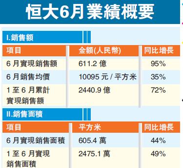 【香港商報網訊】中國恒大(3333)昨發布銷售簡報,今年6月新開盤32個項目,合約銷售額為611.2億(人民幣,下同),位居行業第一,同比增95%,環比增60%,亦實現銷售面積605.4萬平方米,同比增44%,環比增63%(見上表)。