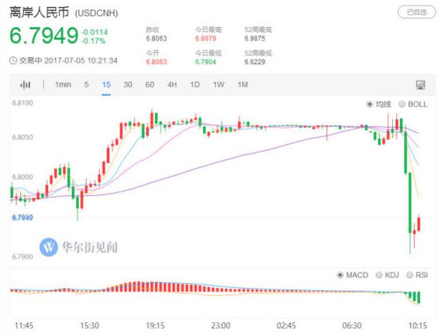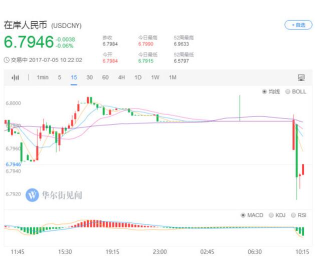 今日早盤,離岸人民幣兌美元一度漲逾170點,現報6.7949。在岸人民幣兌美元一度漲約80點,現報6.7946。