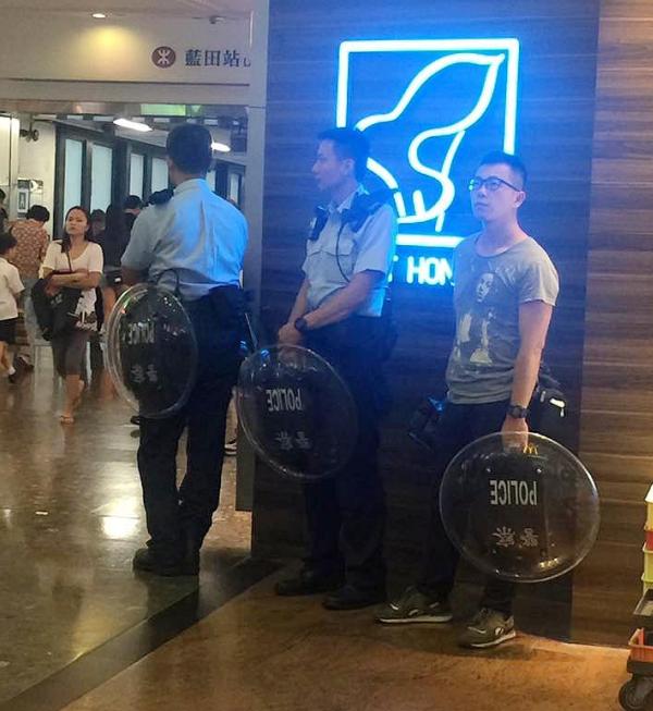 警方派出逾半百警員手持盾牌警员到藍田站附近戒备。