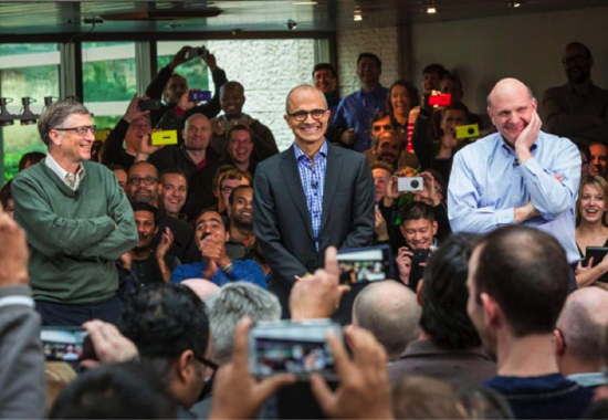 微软三代领军人物齐亮相:从左至右分别为比尔·盖茨、萨蒂亚·纳德拉和史蒂夫·鲍尔默。(资料图)