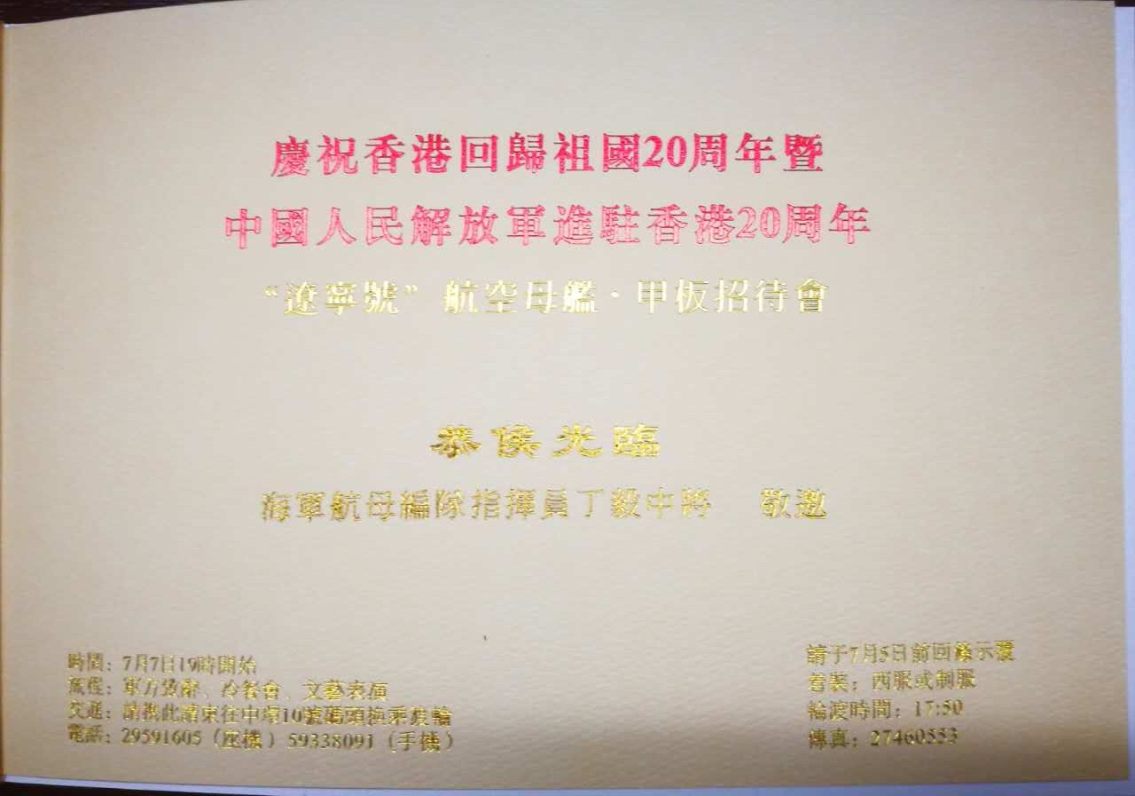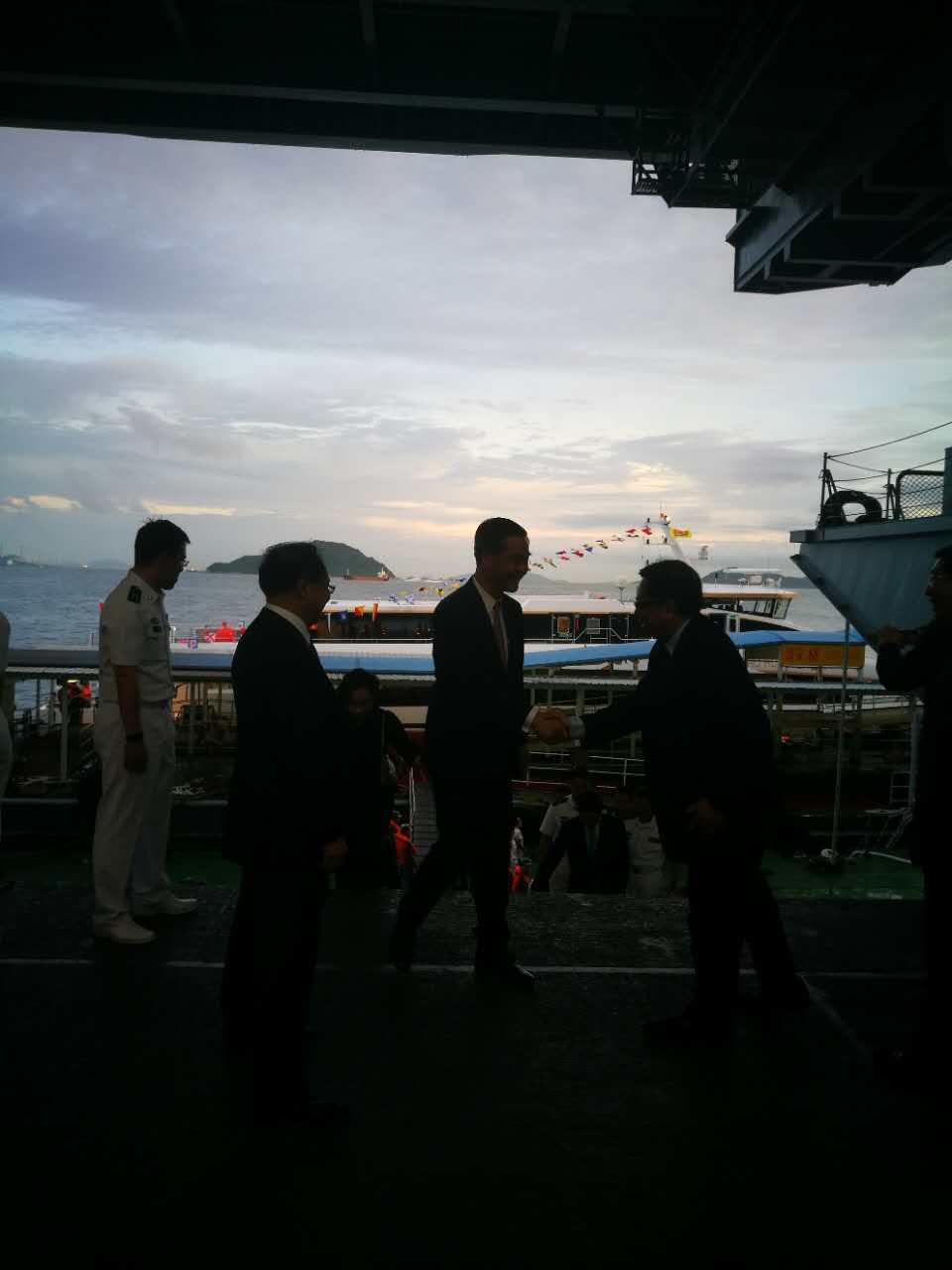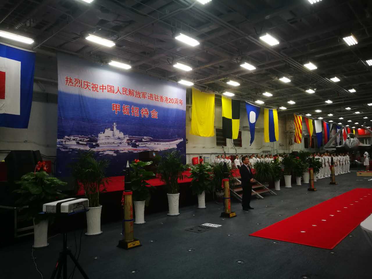 夏日的维多利亚港湾海风习习,辽宁舰灯火通明。下午6时许,应邀出席甲板招待会的香港特区政府主要官员、中央驻港机构领导、港区全国人大代表和全国政协常委、香港部分社会知名人士,澳门特别行政区政府领导及驻港澳部队领导约500名嘉宾,乘坐交通艇登上辽宁舰。
