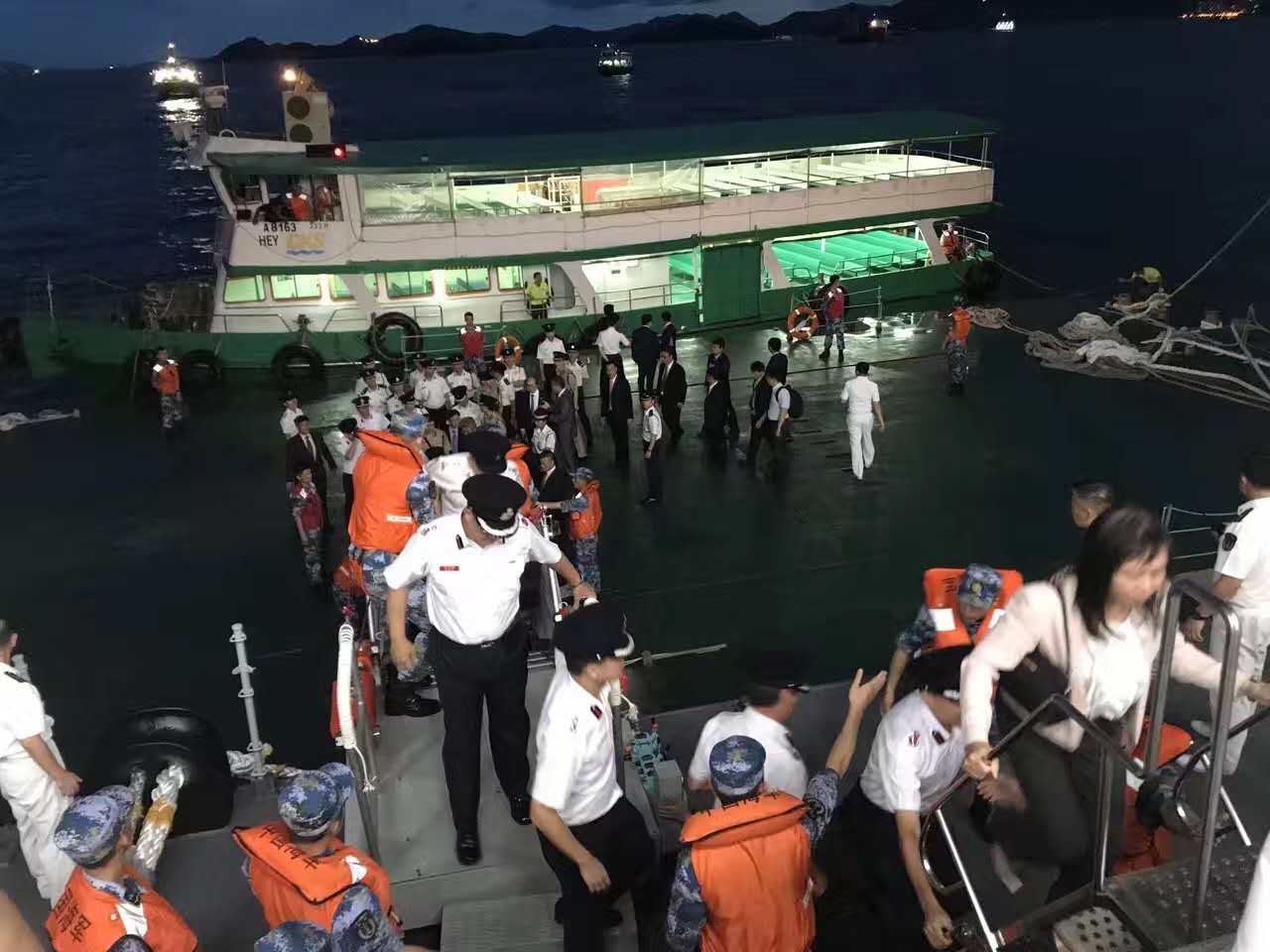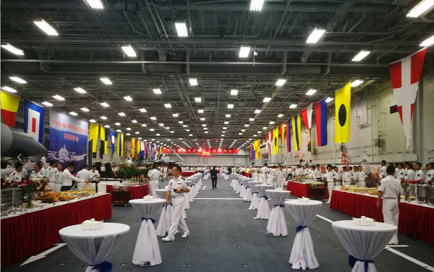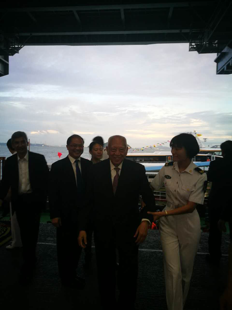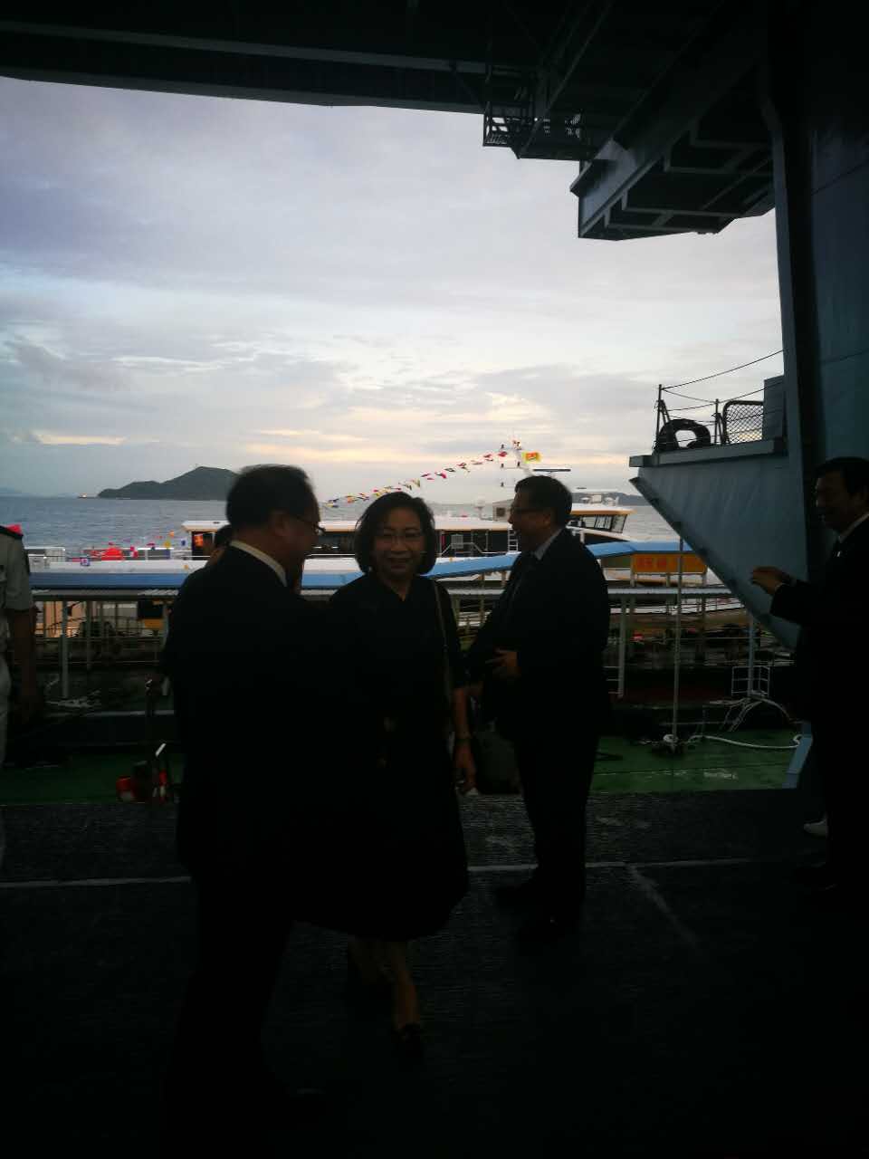 夏日的维多利亚港湾海风习习,辽宁舰灯火通明。下午6时许,应邀出席甲板招待会的香港特区政府主要官员、中央驻港机构领导、港区全国人大代表和全国政协常委、香港部分社会知名人士,澳门特别行政区政府领导及驻港澳部队领导约500名嘉宾,乘坐交通艇登上辽宁舰。
