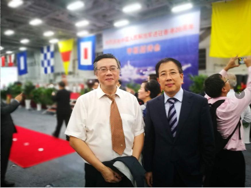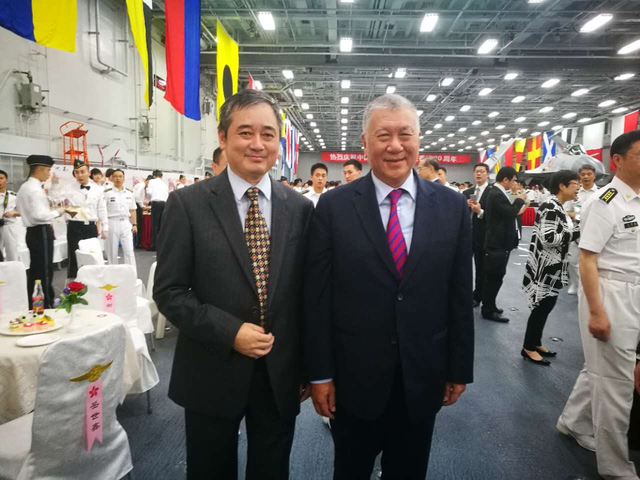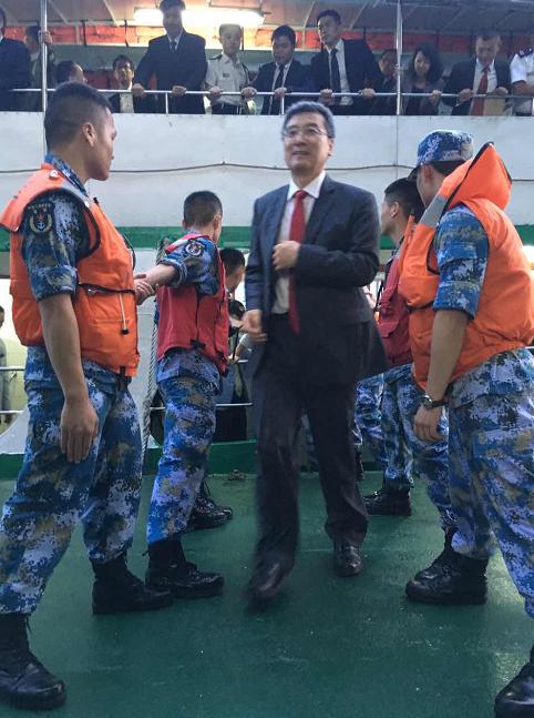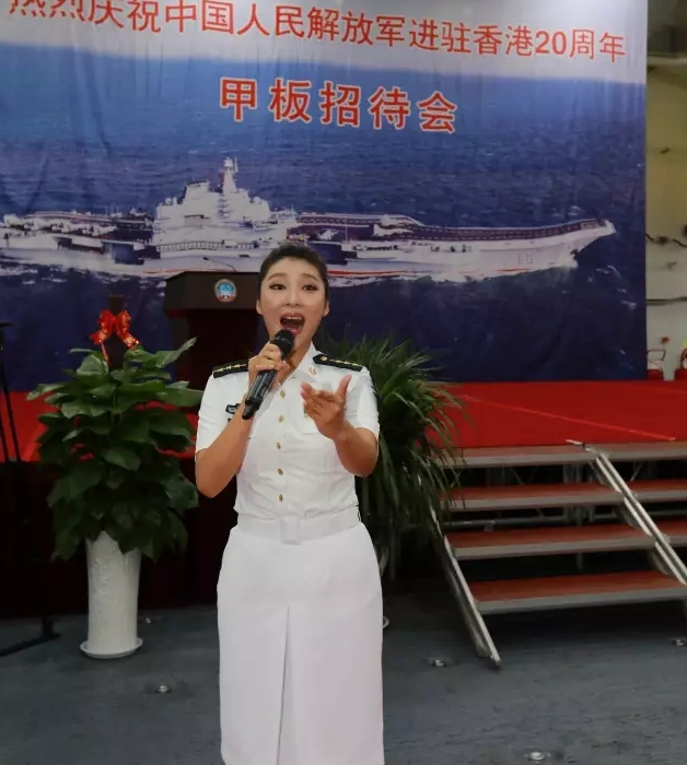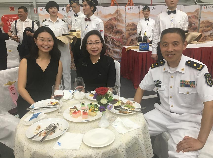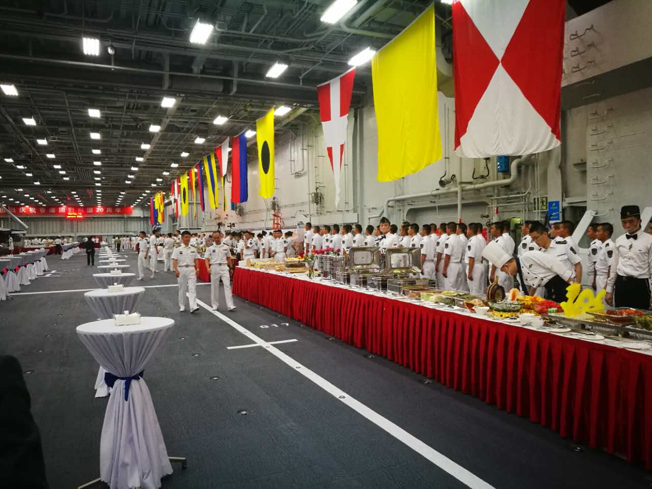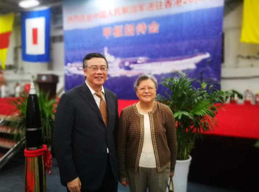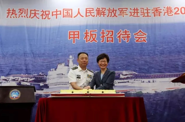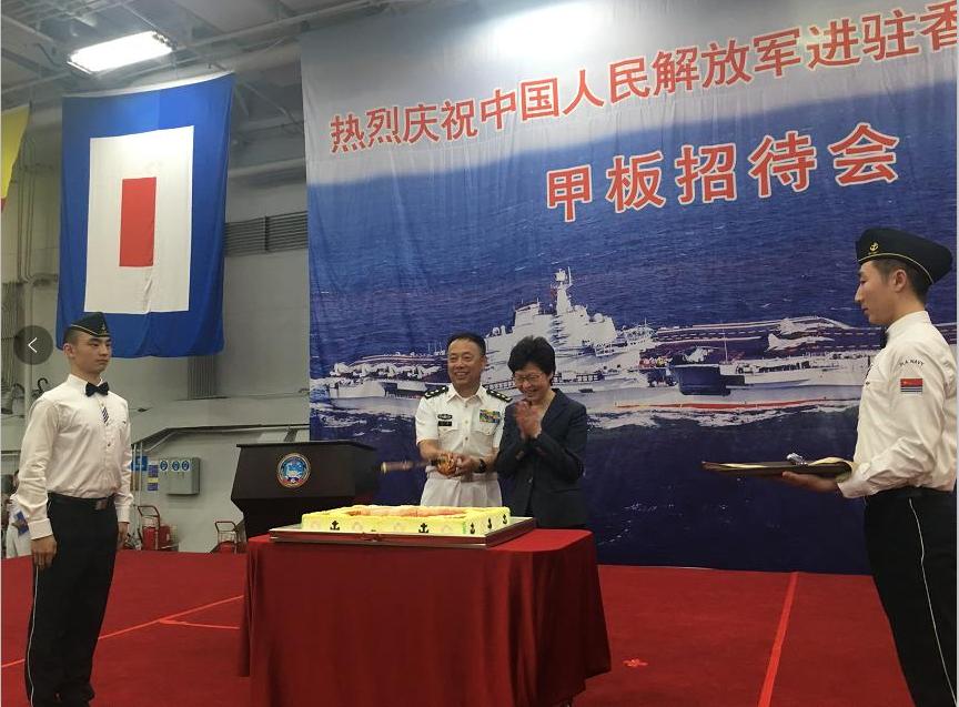 甲板招待会上,丁毅与林郑月娥共同切开象征欢乐和祝福的宴会蛋糕。编队官兵与在场嘉宾亲切交谈,并合唱了歌曲《我的祖国》,氛围和谐融洽。