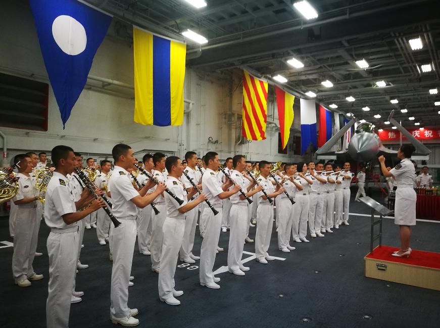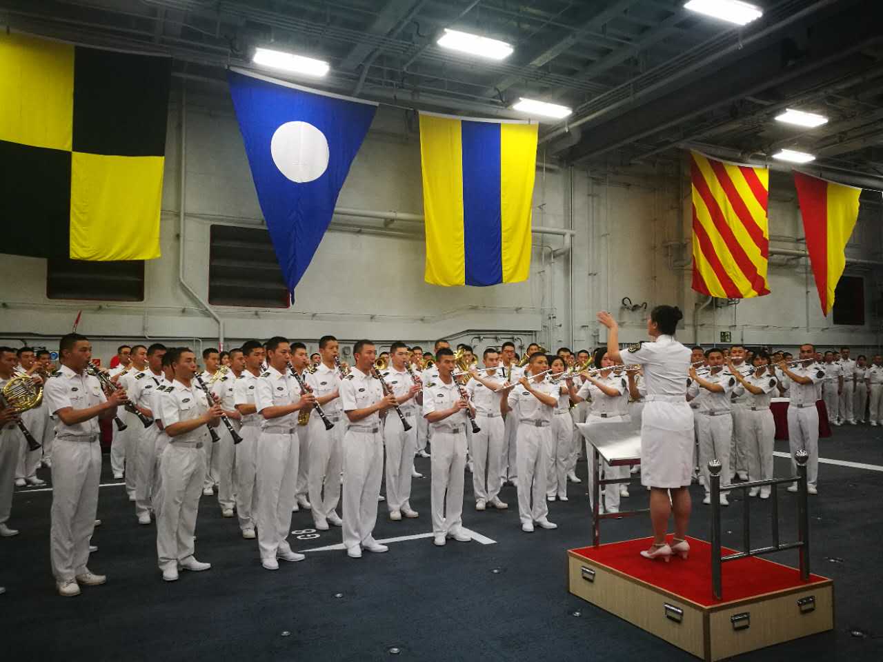 辽宁舰军乐团官兵在甲板招待会上演奏乐曲