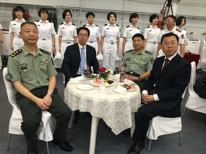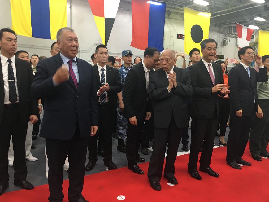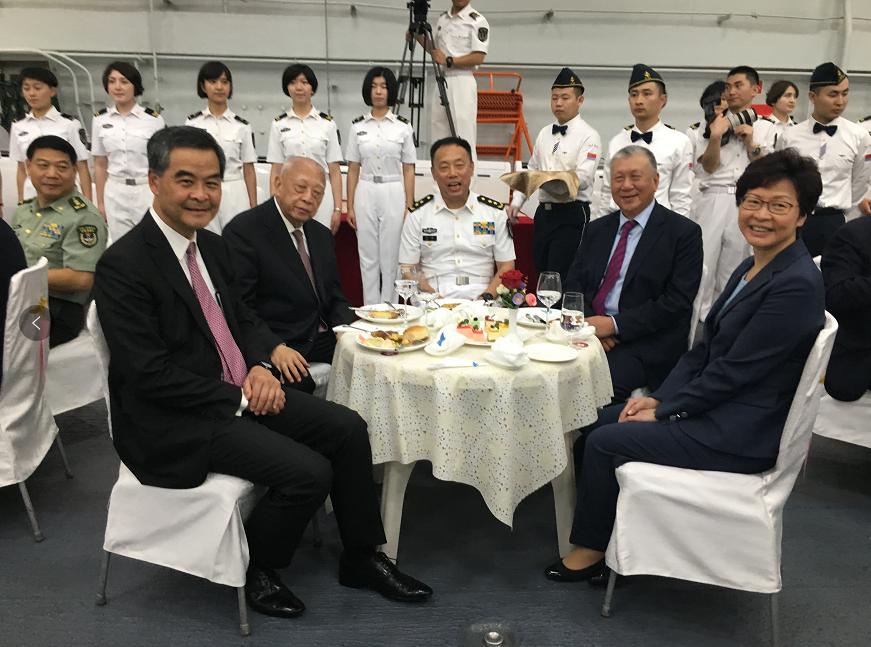 「遼寧號」晚上甲板招待會,3位政協副主席董建華(左二)、何厚鏵(右二)、梁振英(左一)及特首林鄭月娥(右一)與航母編隊指揮員丁毅中將同桌。記者 木子攝