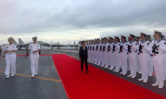 香港特别行政区行政长官林郑月娥在辽宁舰飞行甲板检阅该舰仪仗队