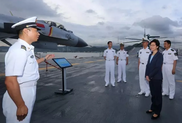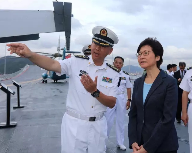香港特别行政区行政长官林郑月娥在辽宁舰飞行甲板听取舰长刘喆介绍